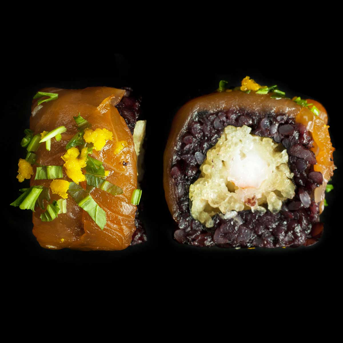Riso Integrale, salmone, tempura, rucola e olio d’oliva extravergine.