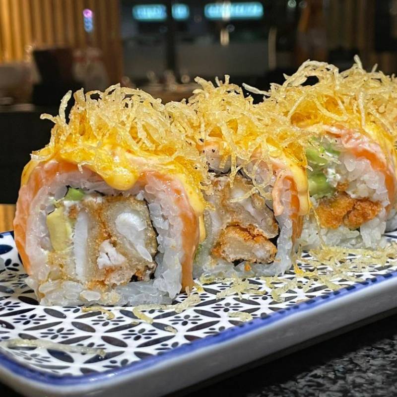Roll ripieno di branzino in tempura, avocado e Philadelphia.