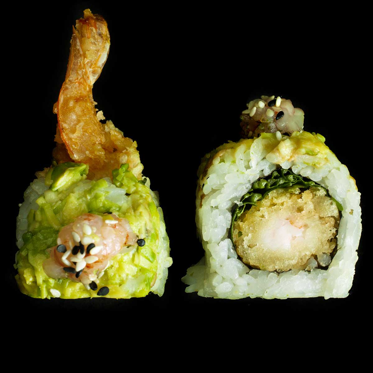 Tempura di gamberi, guacamole, gambero rosso, olio oliva e polvere di alga nori.