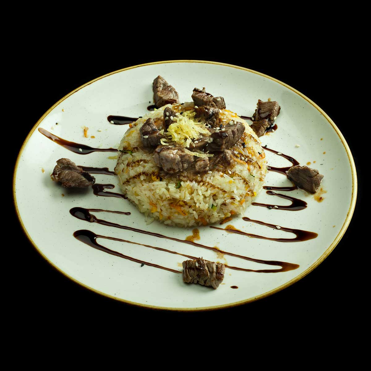 Riso con vitello argentino in salsa Yakiniku.