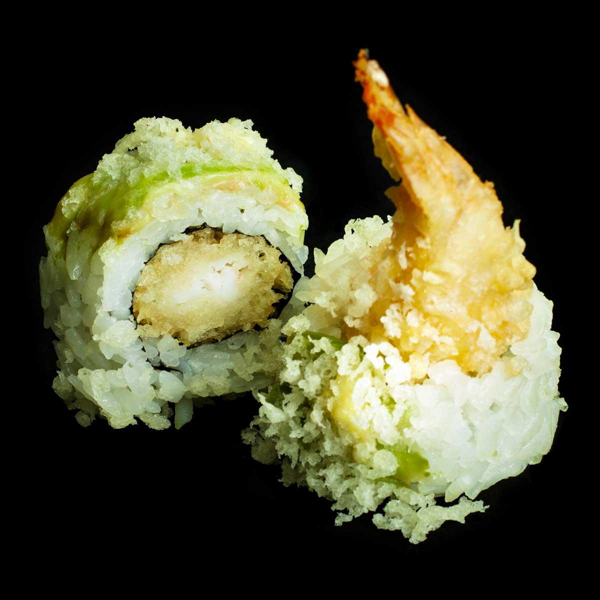 Shrimps tempura, avocado, tempura flakes, kewpie mayo, teriyaki sauce.