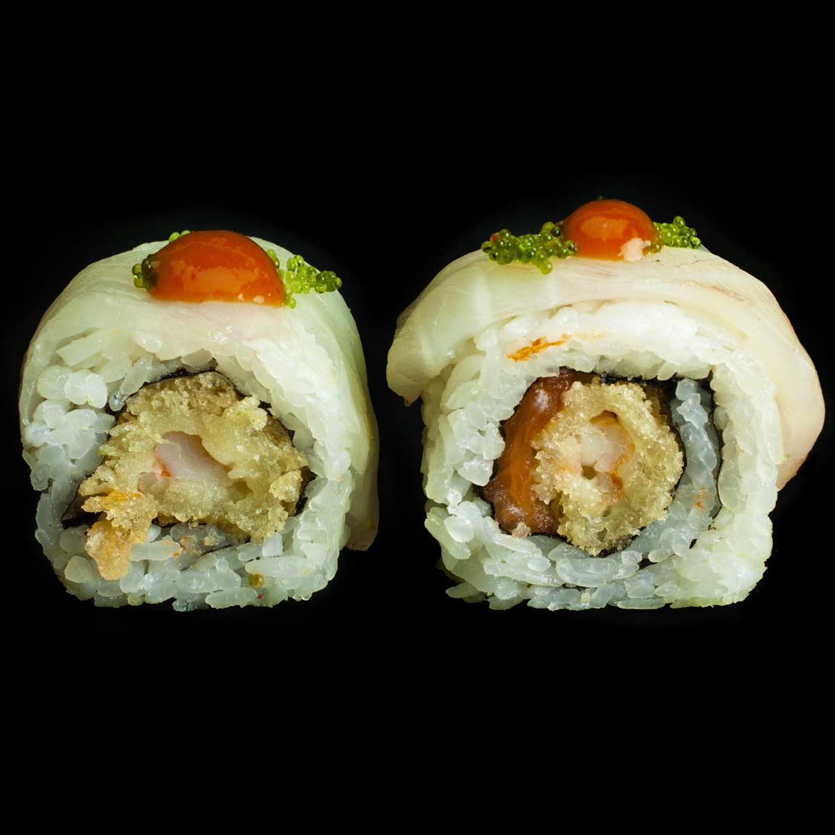 Tempura gamberi, salmone, branzino, caviale tobiko, salsa sriracha.