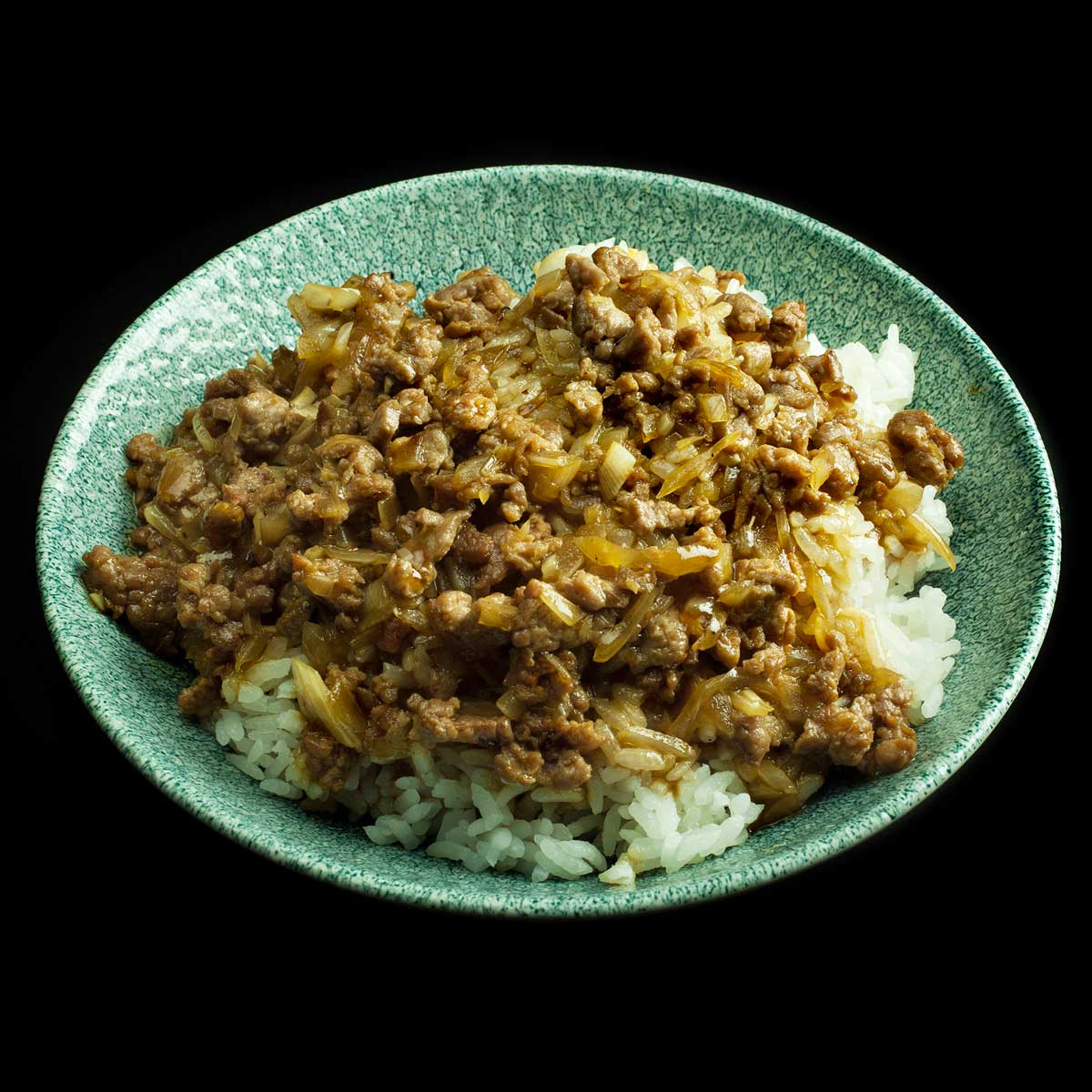 Riso bianco con manzo, cipolla e zenzero tritato.