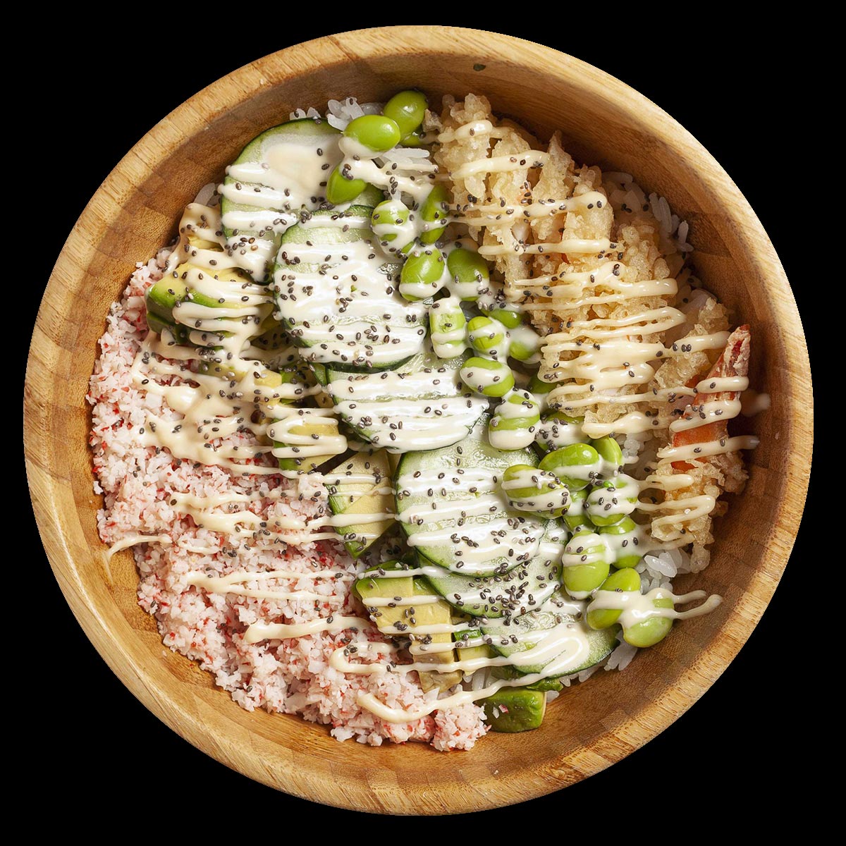 Poke bowl con tempura di gamberi, polpa surimi, avocado, cetriolo, edamame, semi di chia, maionese.