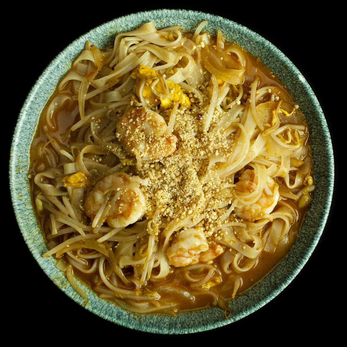 Noodles thailandesi leggermente piccante con gamberi, anacardi, germogli di soia e cipolla.