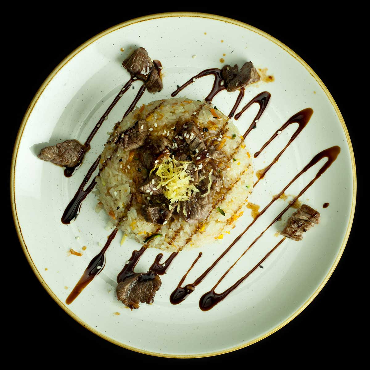 Riso con vitello argentino in salsa Yakiniku.
