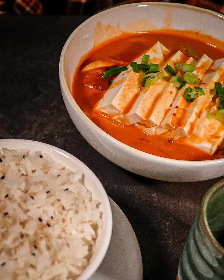 Zuppa calda con kimchi leggermente piccante, funghi e bacon.