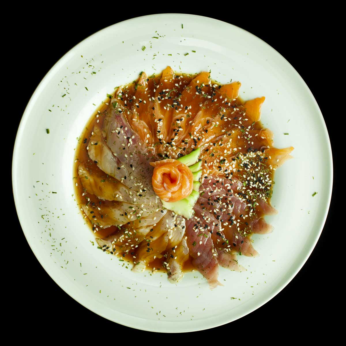 Carpaccio di salmone, tonno e branzino in salsa ponzu agrumata.