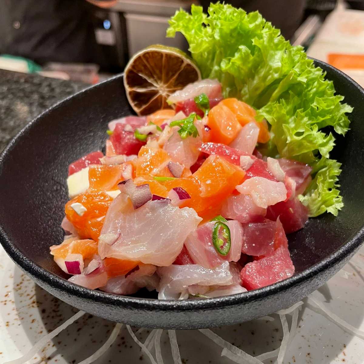 Pescato misto a cubetti, cipolla rossa, feta, coriandolo, succo di lime, olio EVO e peperoncino fresco.