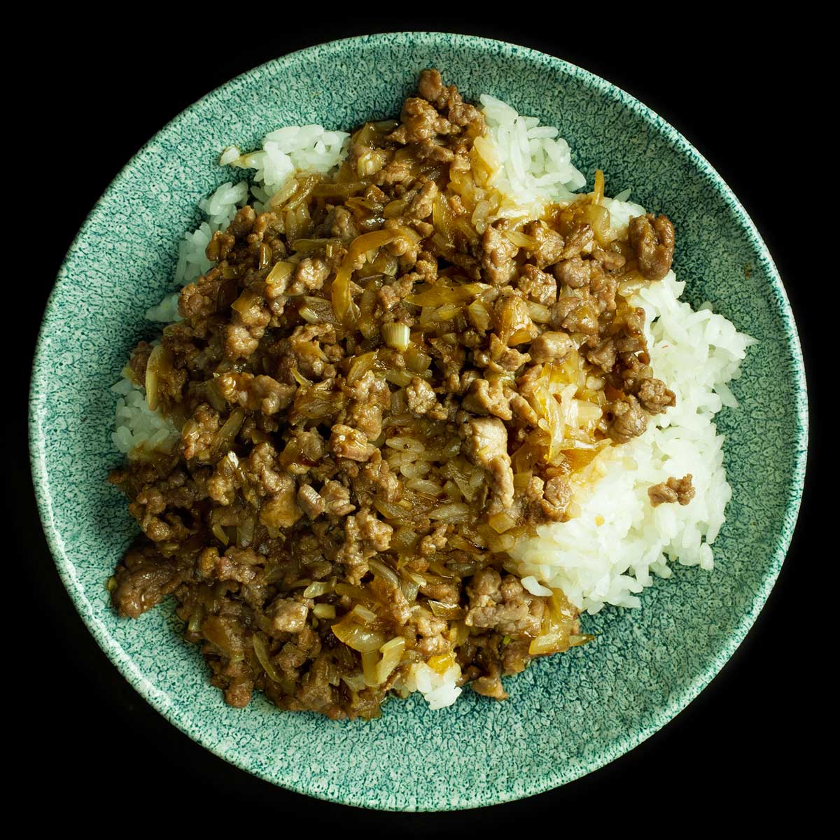 Riso bianco con manzo, cipolla e zenzero tritato.