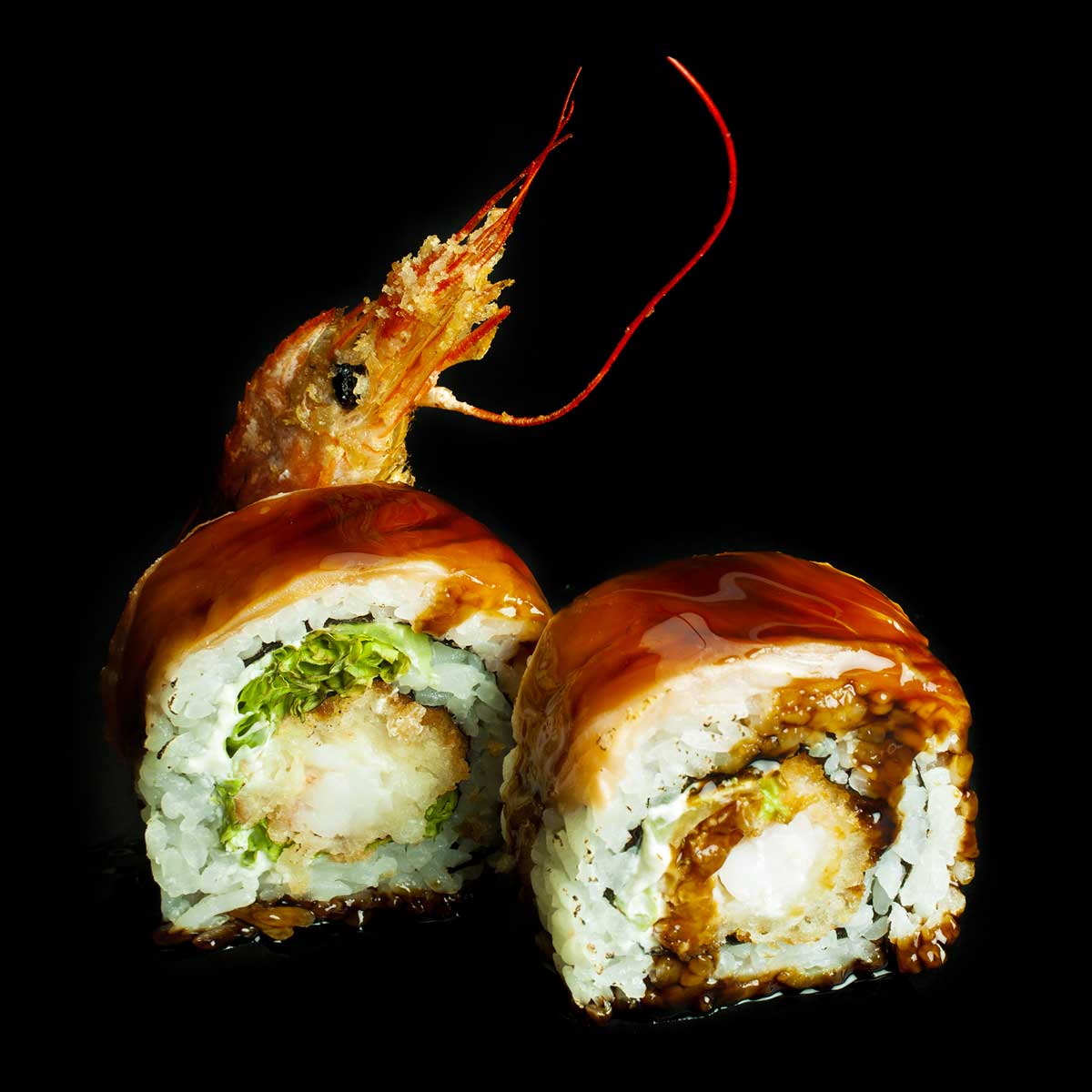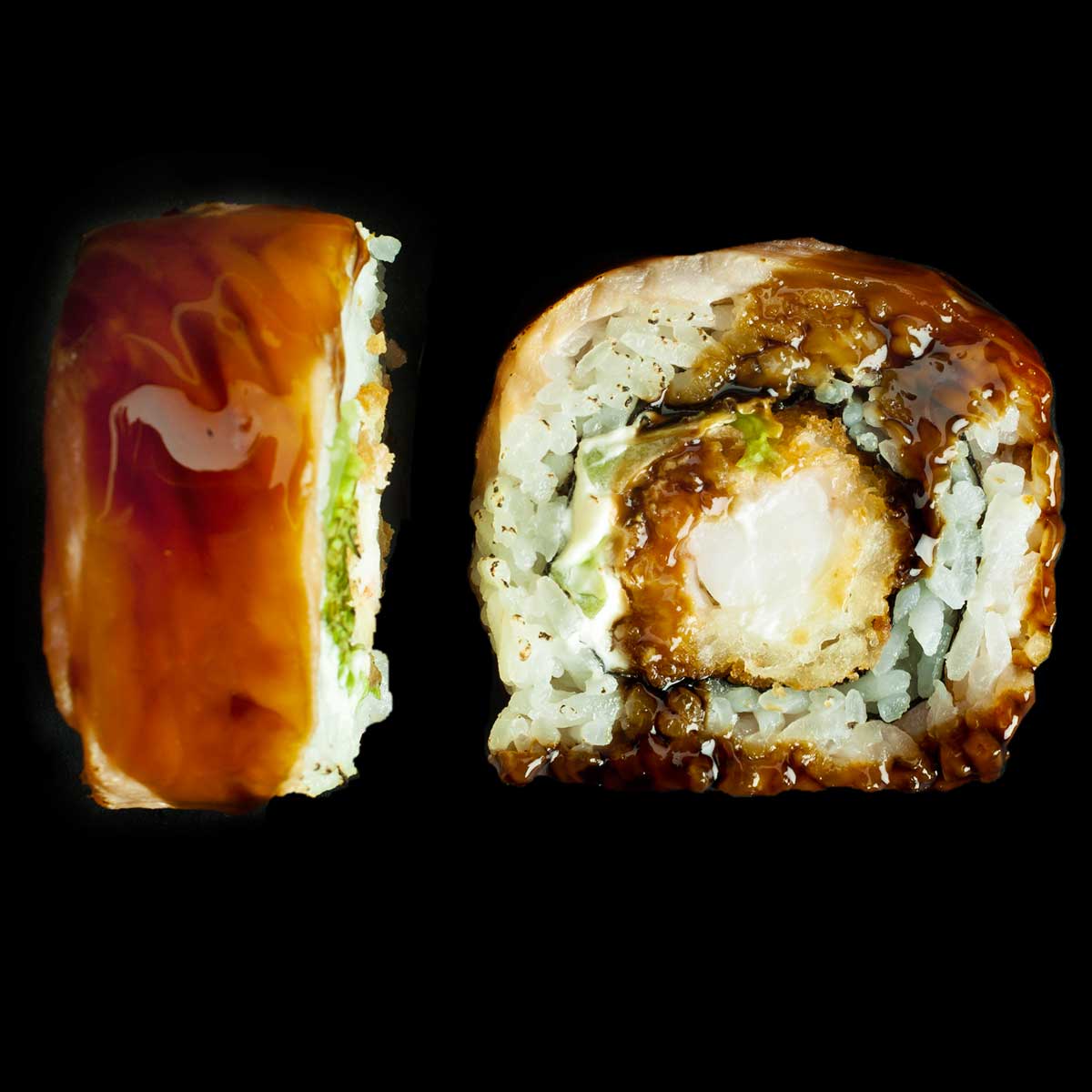 Tempura gamberone, salmone scottato, Philadelphia, salsa Teriyaki.