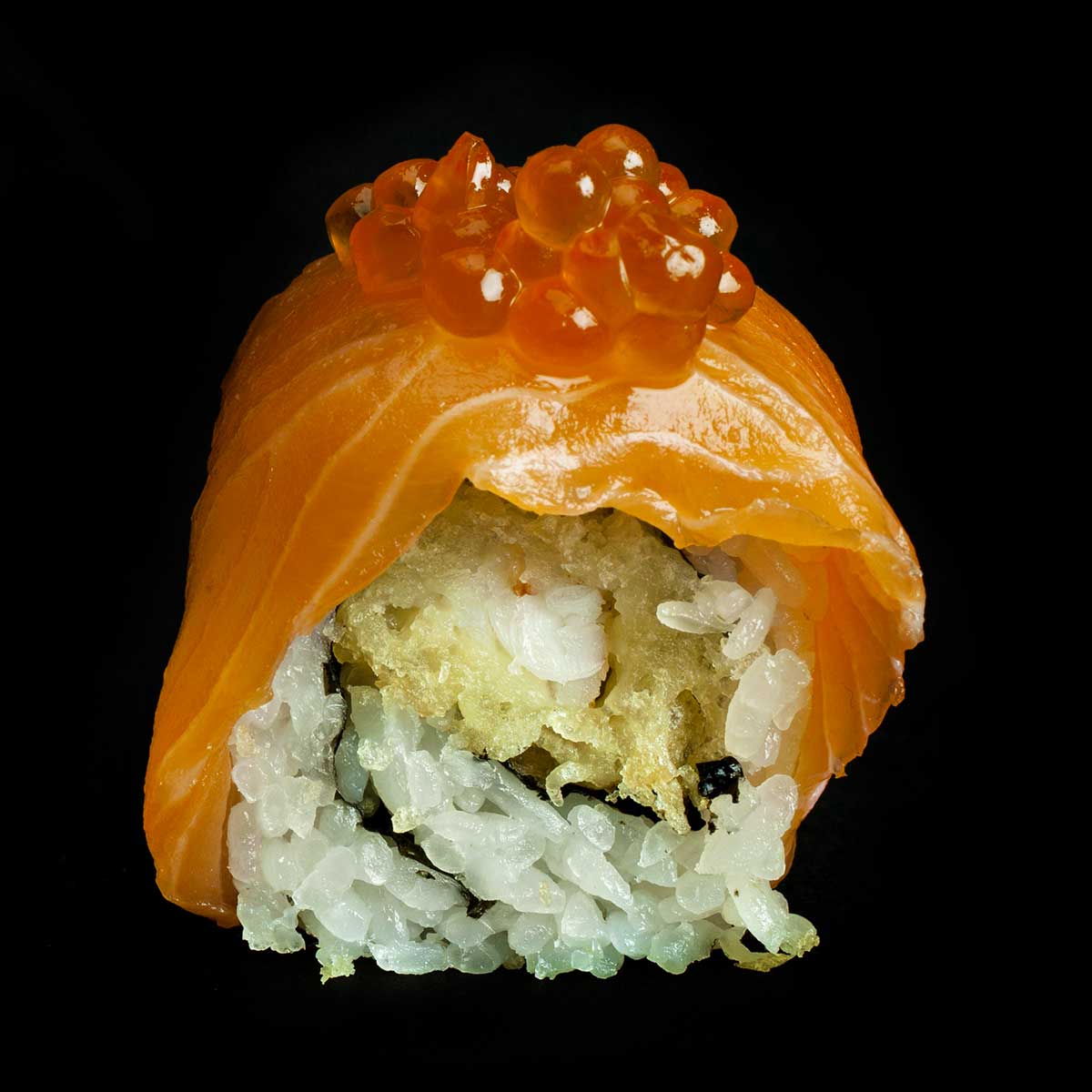 Shrimps tempura, salmon, ikura caviar, teriyaki sauce.