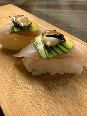 Nigiri di ricciola, avocado, tartufo fresco estivo e mayo al tartufo scorzone